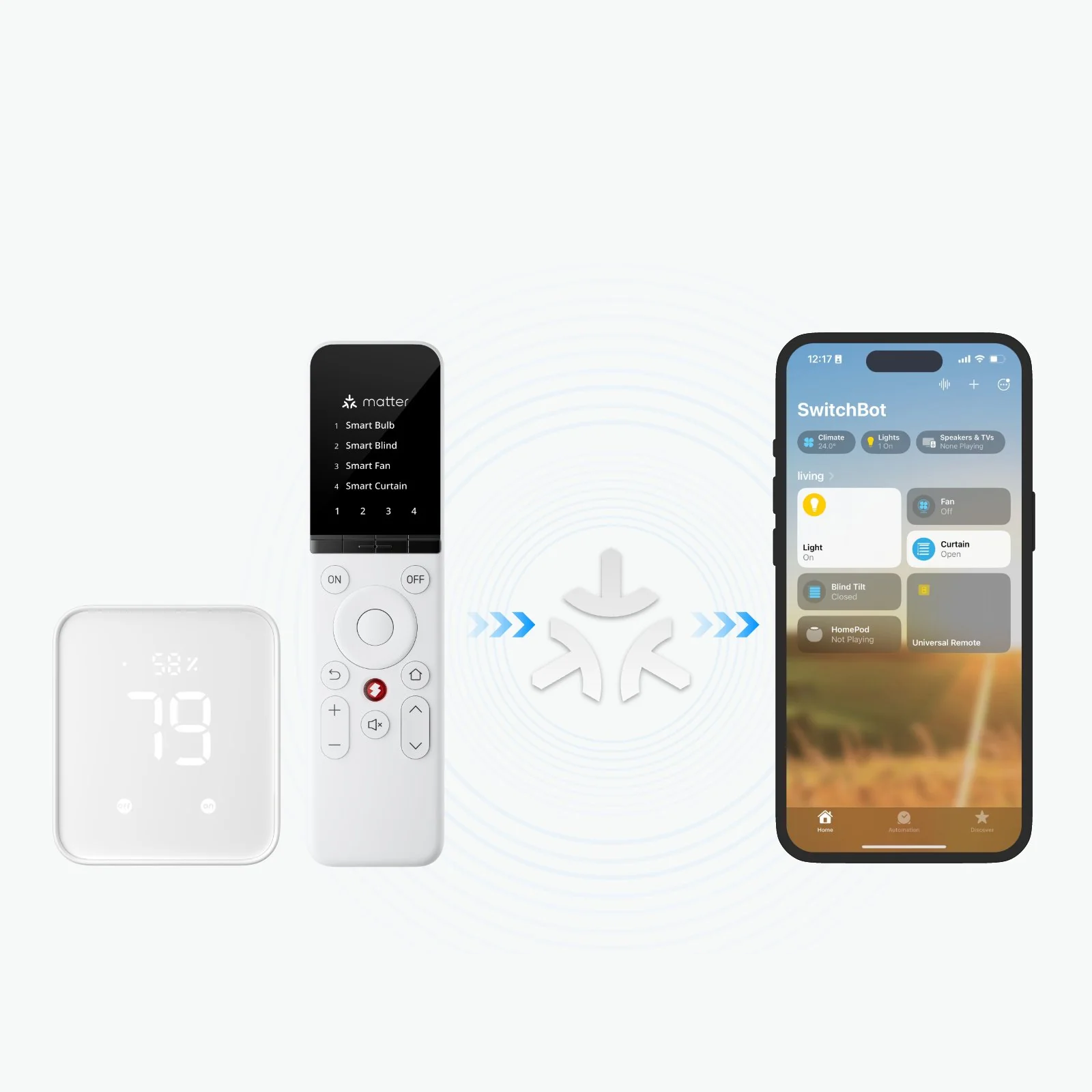 Možete upotrijebiti Universal Remote za upravljanje pametnim kućnim uređajima s Bluetooth oznakom SwitchBot i omogućiti SwitchBot Curtainu da otvori vaše zavjese, reći SwitchBot Botu da pritisne prekidač za svjetlo ili čak kontrolirati Blind Tilt za otvaranje roleta kako bi sunčeva svjetlost ušla, sve bez potrebe za pametni pomoćnik ili pametni telefon za upravljanje njima.